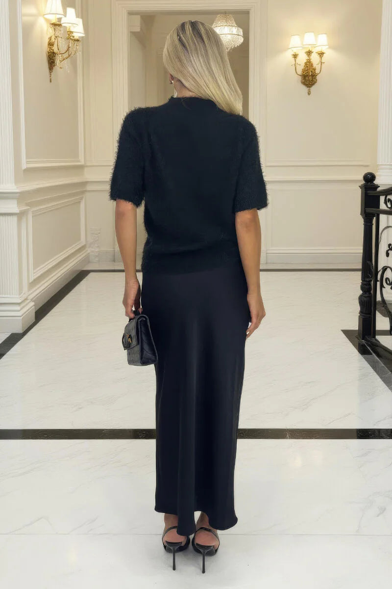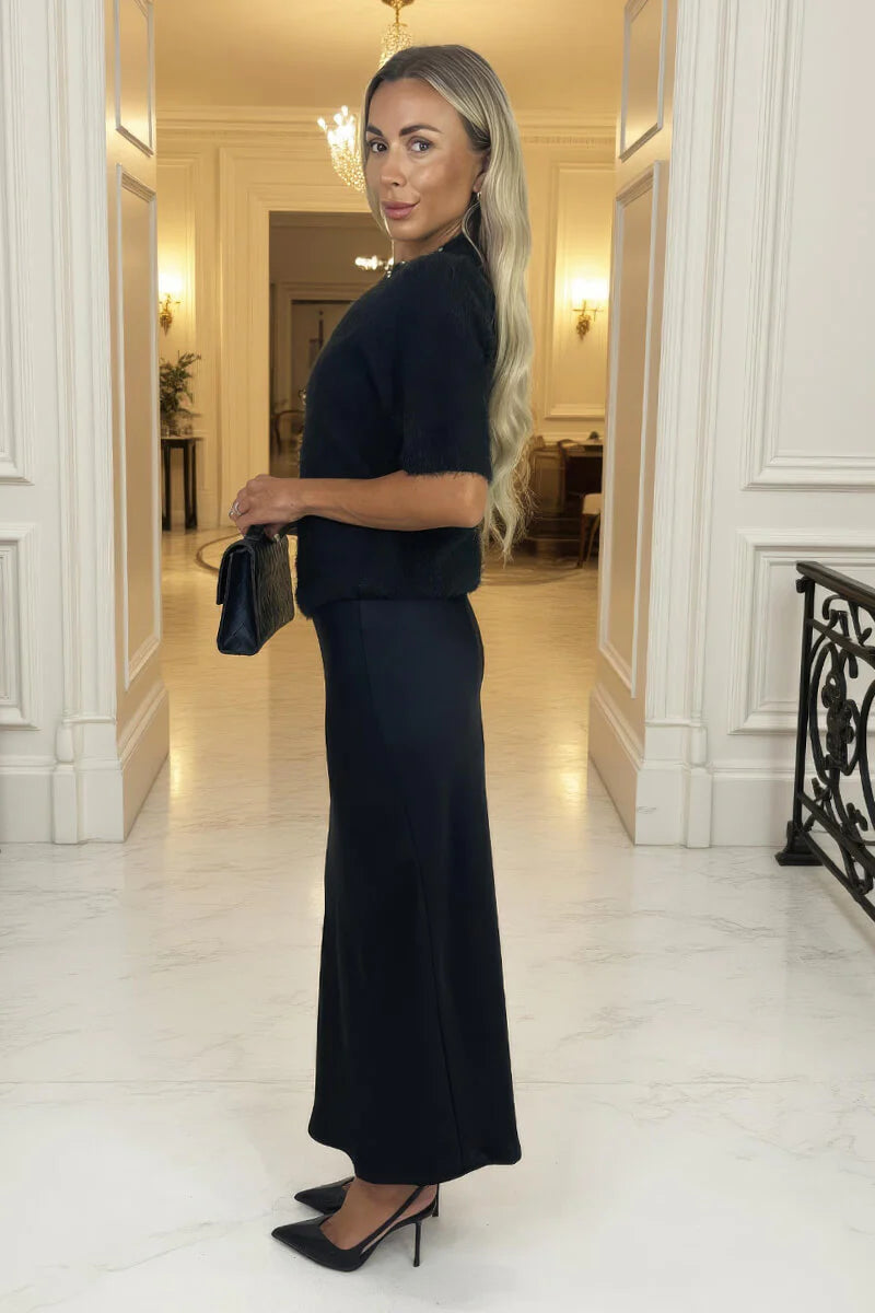 This AX Paris black embellished neck fluffy knit top is a must have for the colder season! Featuring fluffy knitted fabric, short sleeves, and a jewel embellished crew neck. Pair this cute top with tailored trousers and boots for a glam spin on an everyday look.