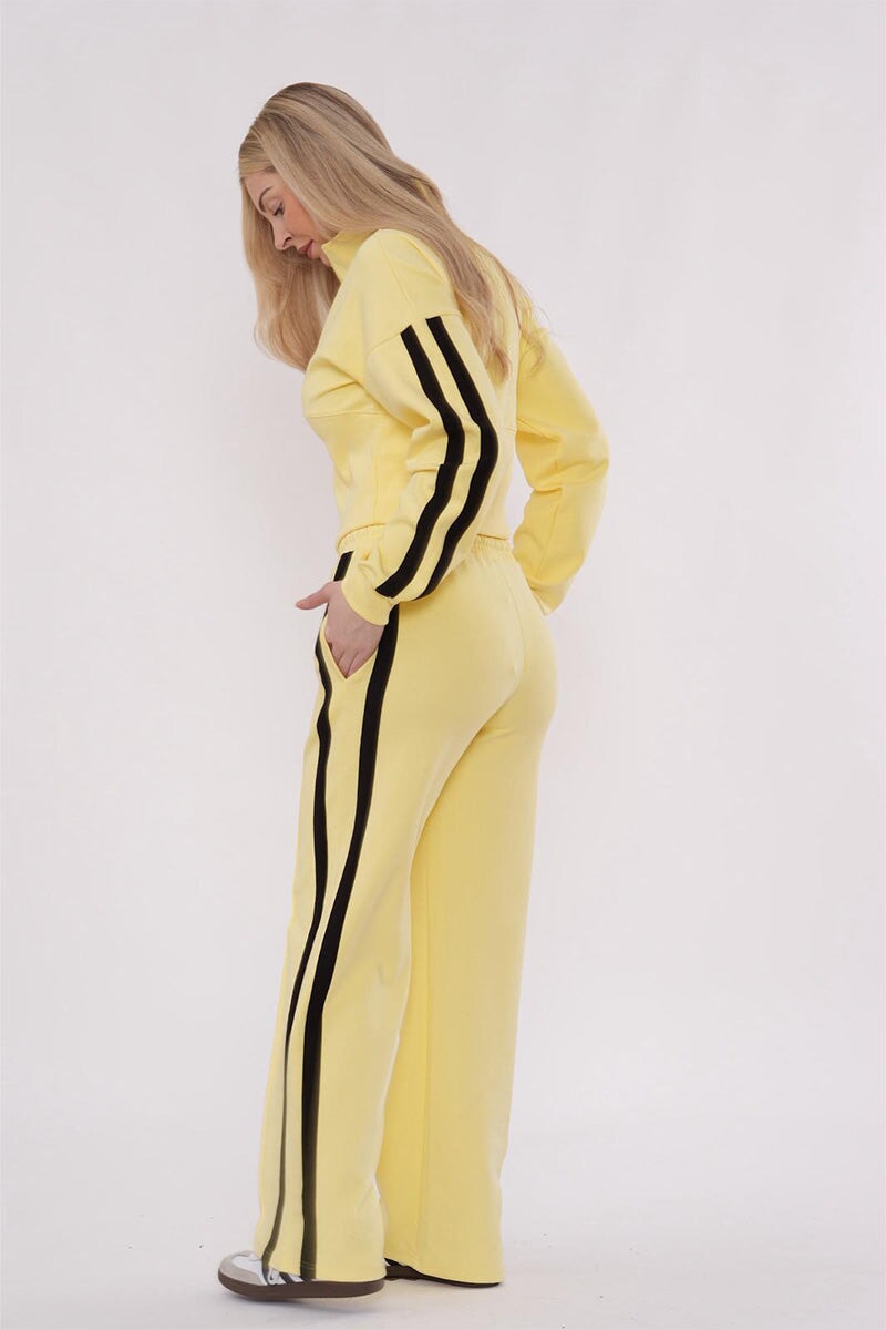 Our soft yellow track suit featuring a contrast double stripe is the perfect stylish throw on for those comfy days! The zip front cropped sweatshirt with ribbed cuff comes with drawstring wide leg trousers. Team this lounge suit together with some trainers for a cool look.